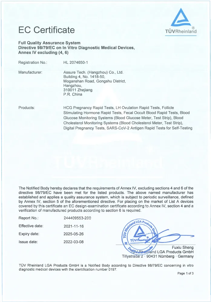 Produkt posiada oznakowanie CE i deklarację zgodności UE, a jego zgodność została potwierdzona przez jednostkę notyfikującą nr 0197. Jest przeznaczony do diagnostyki in vitro i samokontroli w warunkach domowych. Wszystkie oznaczenia, instrukcje oraz interfejs użytkownika są w języku polskim.