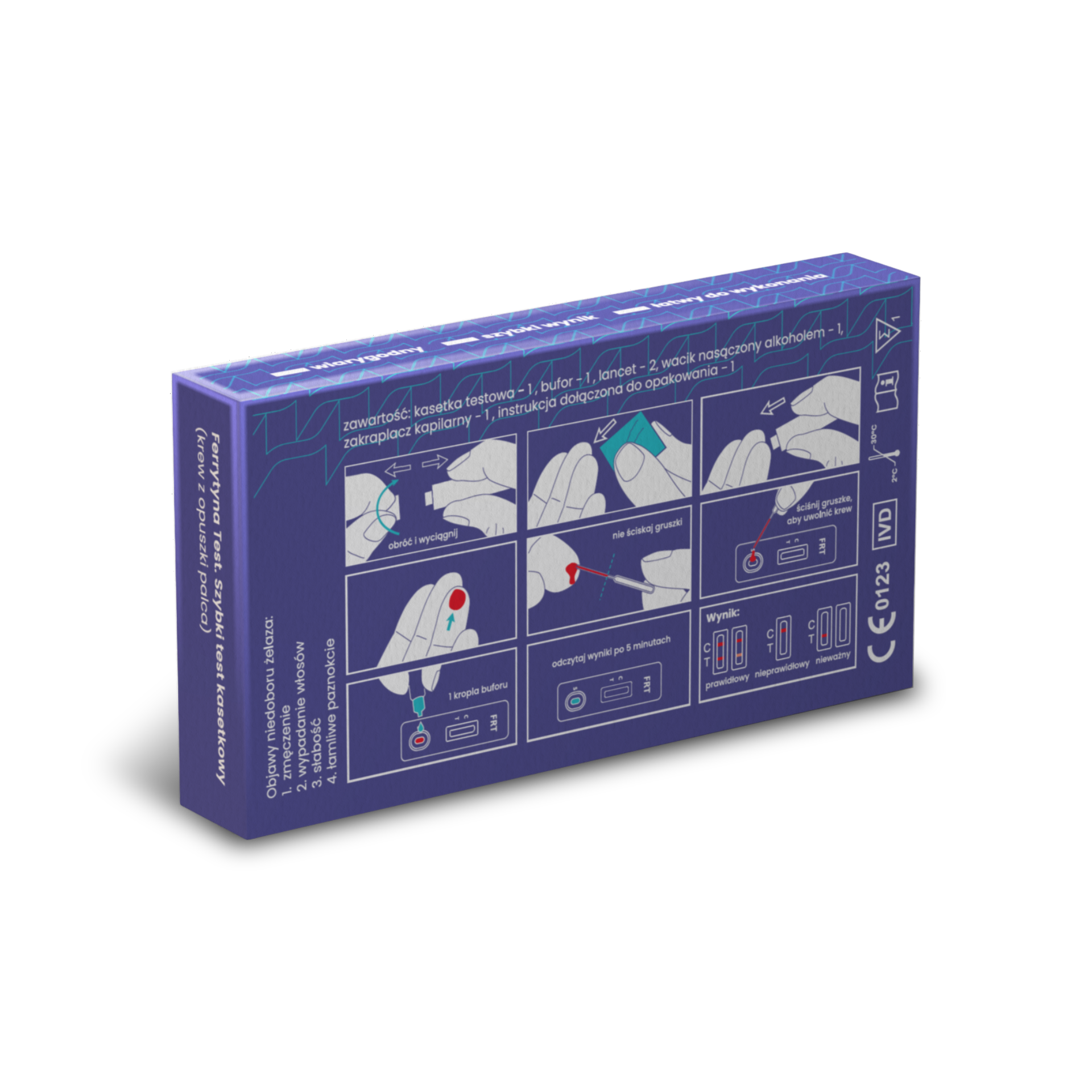 Ferrytyna Test to szybki, domowy test diagnostyczny w formie kasetkowej, który umożliwia ocenę poziomu ferrytyny – białka odpowiedzialnego za magazynowanie żelaza w organizmie. Wykrycie zbyt niskiego poziomu ferrytyny może pomóc w rozpoznaniu niedoboru żelaza, jednej z głównych przyczyn niedokrwistości (anemii). Test jest przeznaczony do użytku domowego i wykorzystuje próbkę krwi kapilarnej pobranej z opuszki palca.
