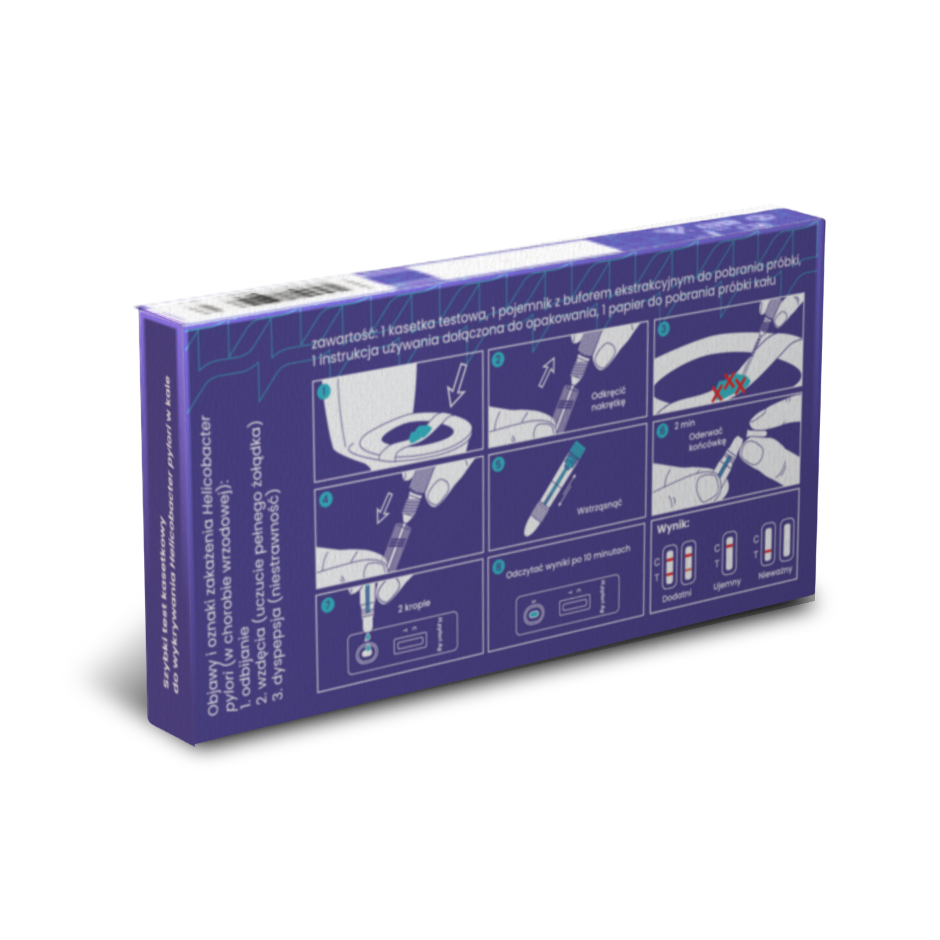 Test Helicobacter pylori to domowy, kasetkowy test diagnostyczny przeznaczony do jakościowego wykrywania antygenów bakterii Helicobacter pylori w próbkach kału. Produkt stanowi skuteczne narzędzie do wstępnej diagnostyki zakażeń przewodu pokarmowego wywołanych tą bakterią. Test pozwala na szybkie uzyskanie wyniku – już po 10 minutach – bez potrzeby korzystania z usług laboratorium, co czyni go wygodnym rozwiązaniem dla osób podejrzewających zakażenie.