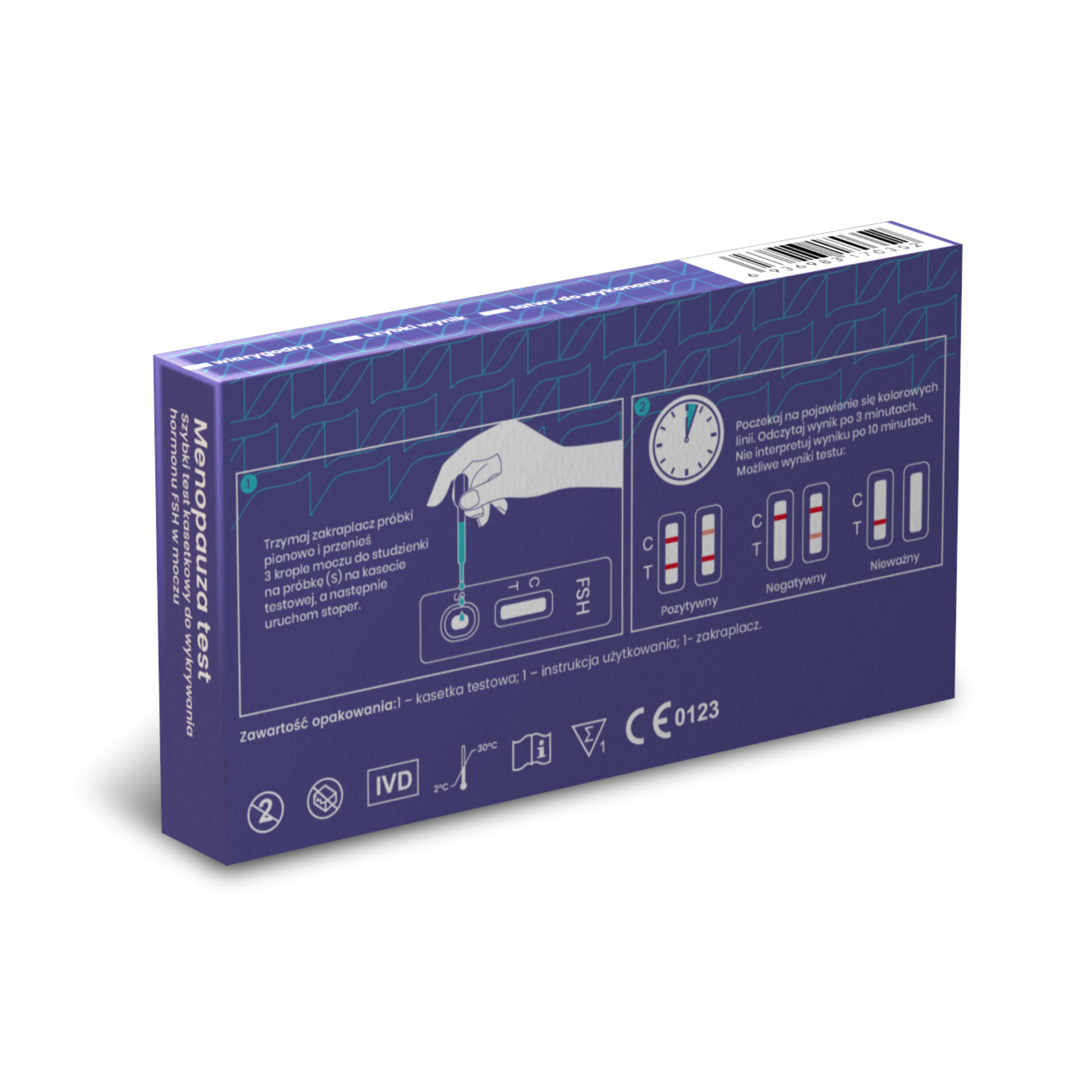 Wyrób medyczny do samokontroli, przeznaczony do jakościowego wykrywania podwyższonego poziomu hormonu FSH (folikulotropowego) w próbce moczu. Test stosowany pomocniczo w rozpoznawaniu okresu okołomenopauzalnego i menopauzy.