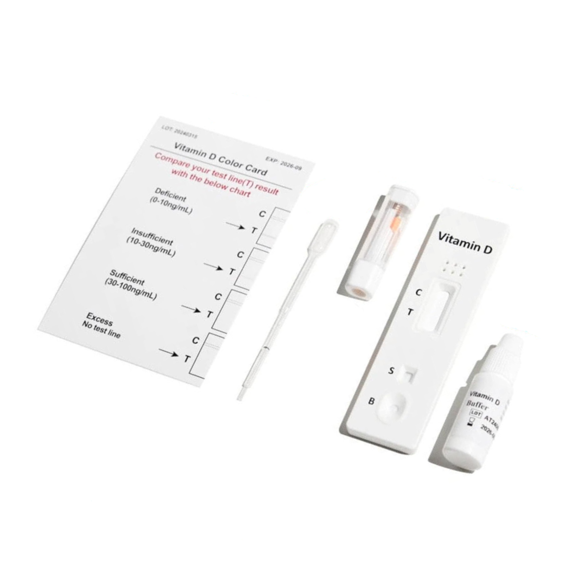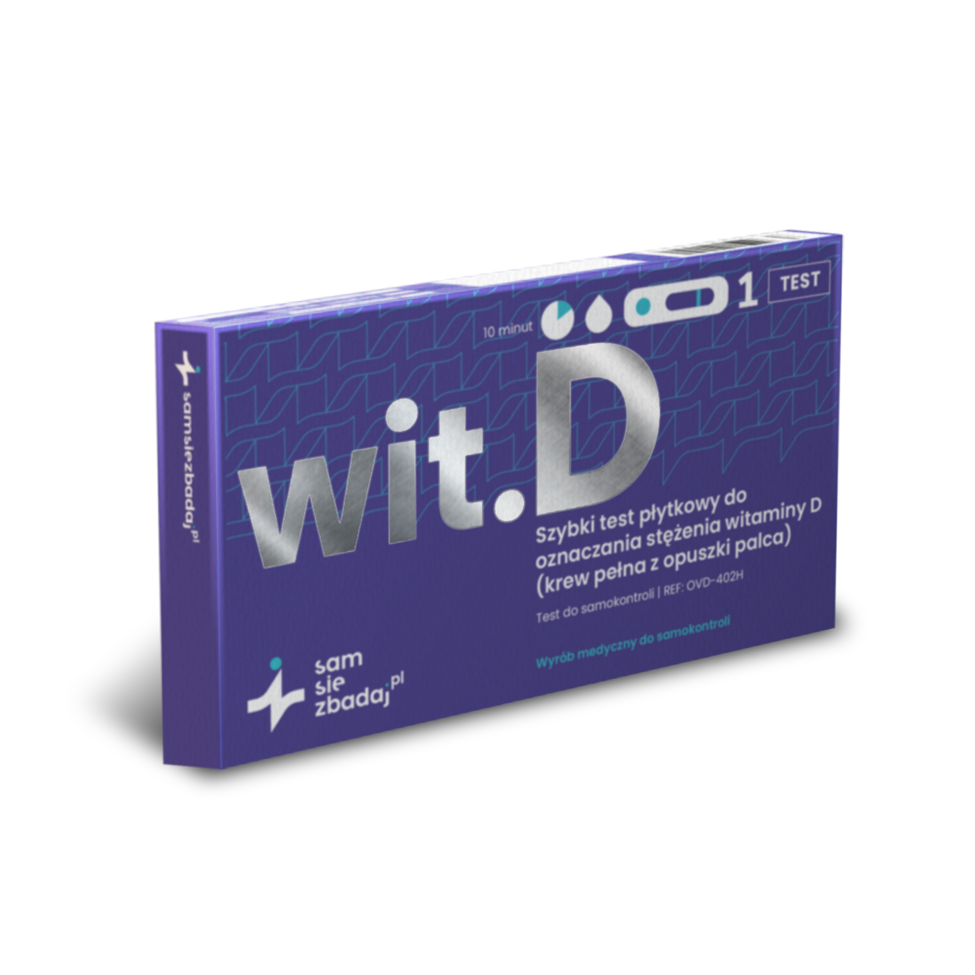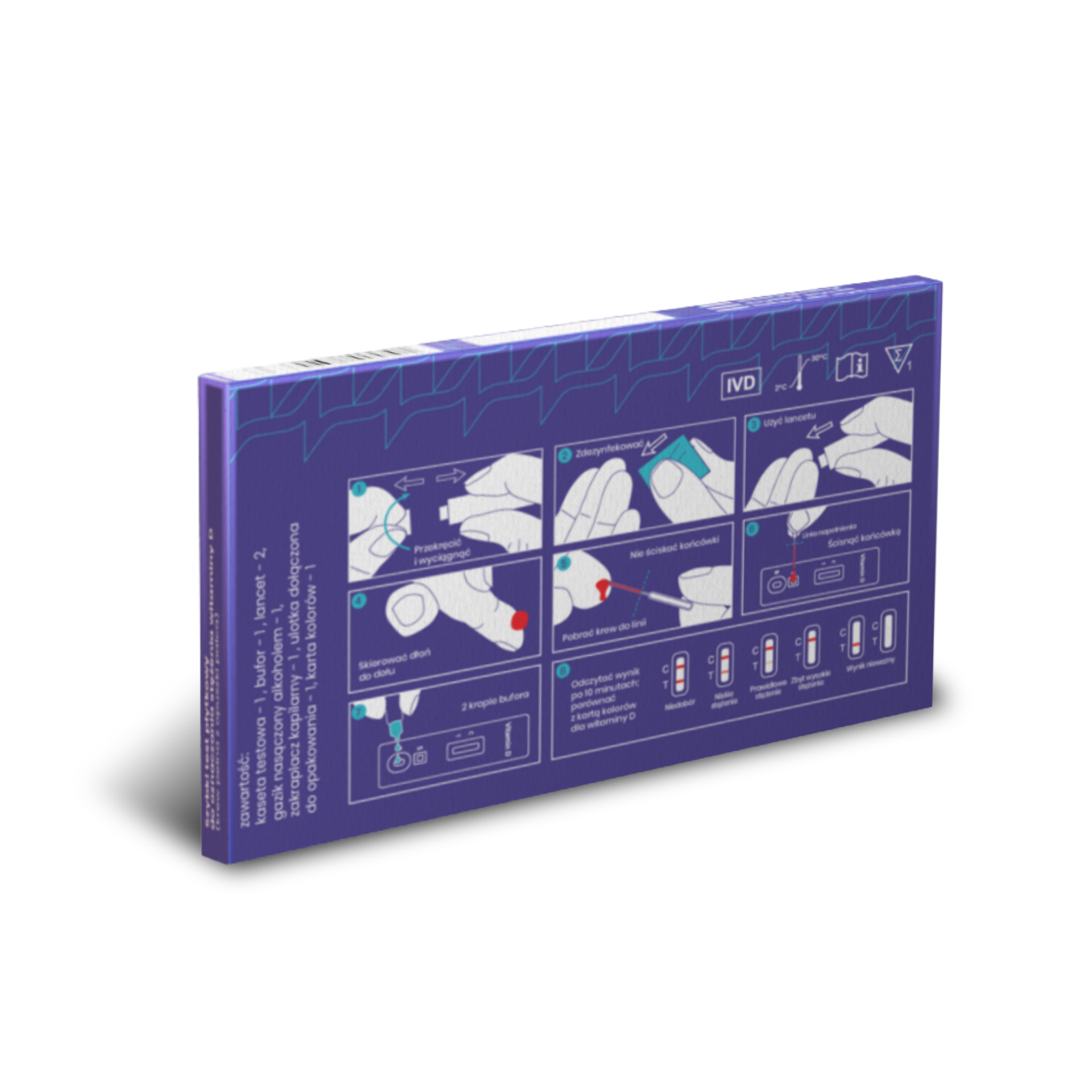 Test na witaminę D3 (Wit.D) to domowy test kasetkowy przeznaczony do półilościowego oznaczania stężenia witaminy D (25(OH)D) w próbce krwi włośniczkowej, pobranej z opuszka palca. Dzięki prostemu mechanizmowi działania i szybkiemu czasowi uzyskania wyniku, test ten pozwala w zaledwie 10 minut ocenić poziom witaminy D w czterech zakresach referencyjnych. Jest to wygodne i skuteczne narzędzie dla osób dbających o swoje zdrowie oraz tych, które chcą świadomie kontrolować poziom witaminy D w organizmie.