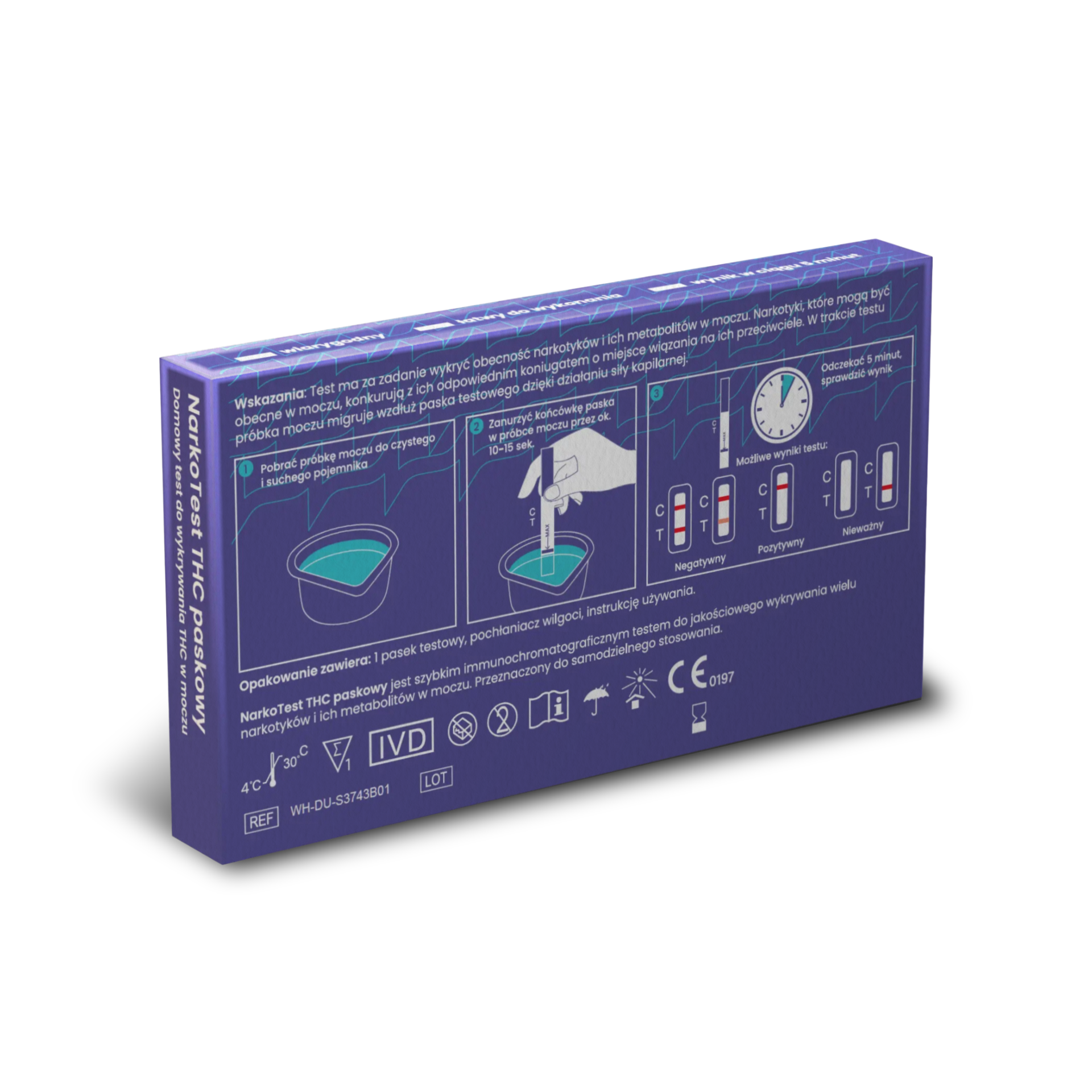Test działa na zasadzie immunochromatografii – po zanurzeniu paska w próbce moczu następuje reakcja chemiczna, która w przypadku obecności THC prowadzi do pojawienia się odpowiedniego wzoru linii testowych. Wynik jest dostępny już po 5 minutach i pozwala na szybką ocenę, czy w organizmie znajdują się ślady marihuany lub jej metabolitów.